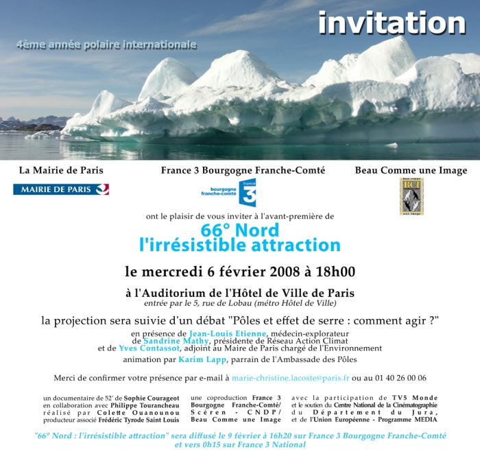 Pour la 4ème Année Polaire Internationale, France 3 et la Mairie de Paris, vous invite le mercredi 6 février 08 à 18h00 à l’avant-première de « 66°Nord, l’irrestible attraction ». A l’Auditorium de l’Hôtel de Ville de Paris – France, la projection sera suivie d’un débat « Pôle et effet de serre : comment agir? »