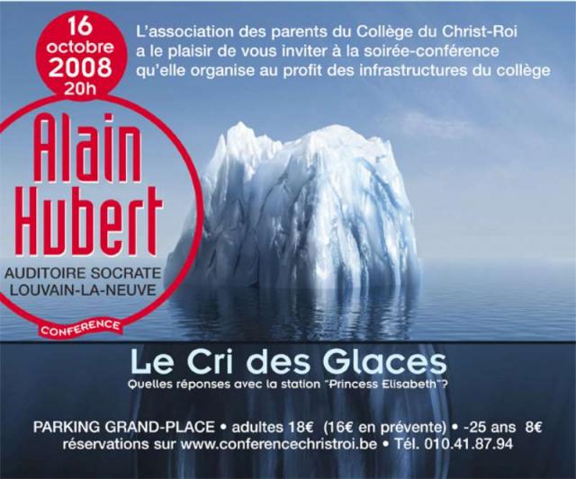 Participez nombreux ce 16 octobre 08 à la conférence » Le Cri des Glaces – quelles réponses avec la station Princess Elisabeth « menée par le célèbre explorateur polaire et Président de la Fondation Polaire Internationale Alain Hubert (photo ci-dessous) qui tentera de répondre aux questions relatives au réchauffement climatique, principal défi écologique de ces prochaines années.