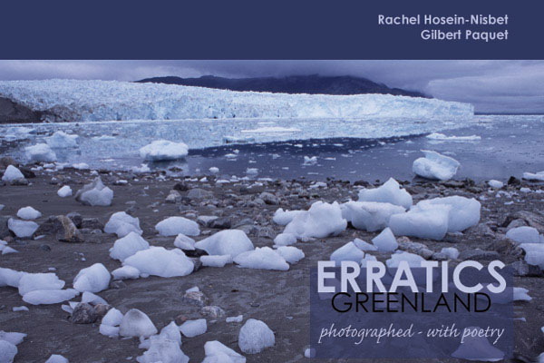 « … Publication du livret Erratics. Greenland : Photographed with poetry , de Rachel Hosein-Nisbet pour les textes et Gilbert Paquet pour les images. Lorsque je suis rentré d’un voyage au Groenland, Rachel a été très enthousiasmée en voyant les images que j’avais rapportées. C’est ce qui lui a donné envie d’écrire des poèmes en relation avec les photos. Ce livre contient 11 poèmes en anglais et 14 photos avec la couverture… ».