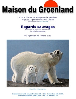 “…Suite à une première exposition de peinture sur les manchots en 2006, la passion de Lyndia Lesauvage l’amène à élargir son champ d’exploration des mondes polaires, en peignant cette fois, des ours. Vernissage le jeudi 27 janvier de 19h à 20h30 à la Maison du Groenland, 75 rue de Richelieu 75002 Paris. N’oubliez pas de vous inscrire en suivant ce lien Les peintures de Lyndia Lesauvage sont exposées du 5 janvier au 5 mars 2011… plus d’info sur www.blog-de-glace.org “