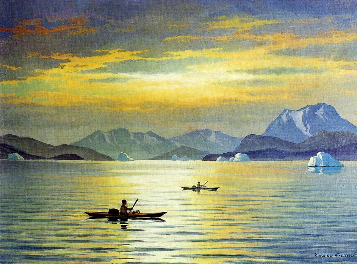 Originally trained as a theater-decoration painter, and later employed as a Marine painter at the Royal Porcelain Factory of Denmark, it was hard to imagine that Emanuel A. Petersen (1894-1948) would become such a popular portrayer of Greenland.